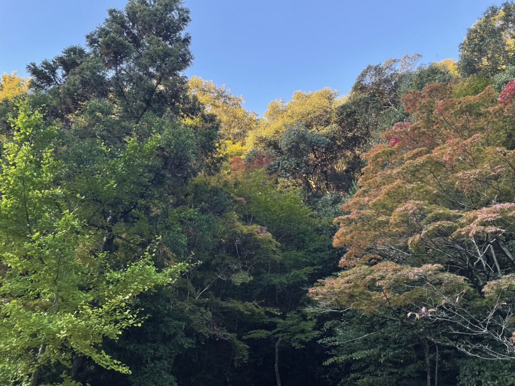 樹々の重なりの、空にいちばん近いところから少しずつ紅葉が始まっています。