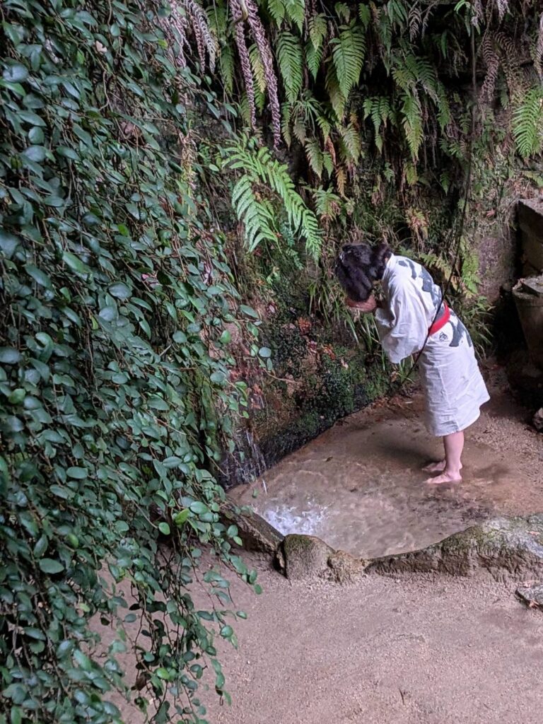 滝入りの時に、この後の書初めのためのお水を汲むくまさん。