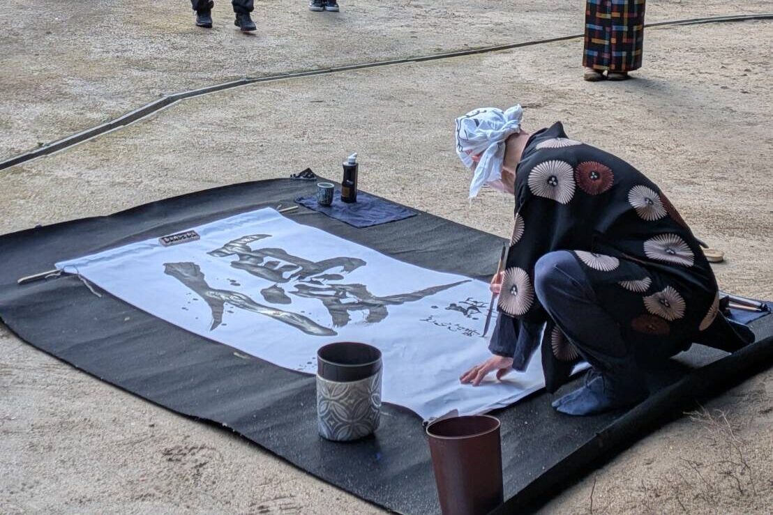 深いお辞儀をもって、令和8年のくまさんによる書初めがはじまりました。