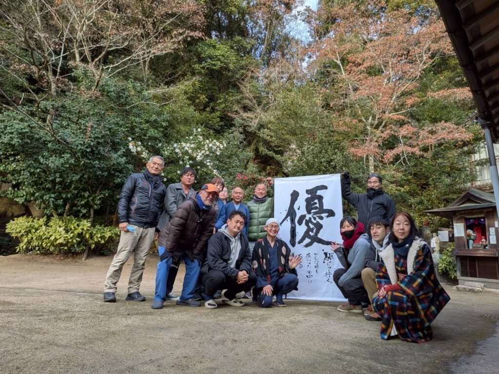 8月6日、市内120ヶ所原爆慰霊碑一斉献水のタペストリーは毎年平和公園のなかでわたしたちの活動を変わらぬ書でお知らせくださり、そして、毎年のこの初滝入りでの書初めで、一年間のわたしたちの活動を書をもって応援くださっています。