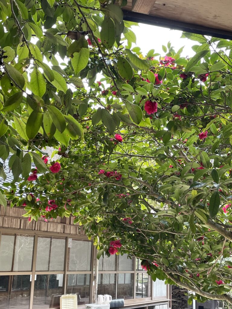 滝を出て、内側から見た山茶花が日に透けて綺麗。